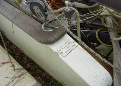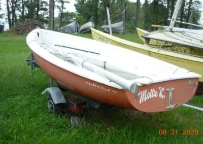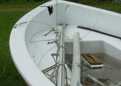CHRYSLER PIRATEER – Approximately 13’, this hull has no spars, sails, rudder or tiller. The tornado of 2020 punctured a hole in the deck above the waterline.
