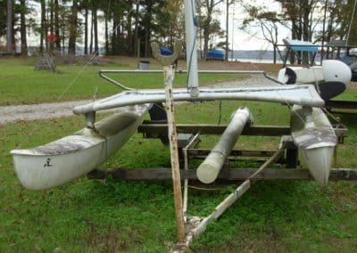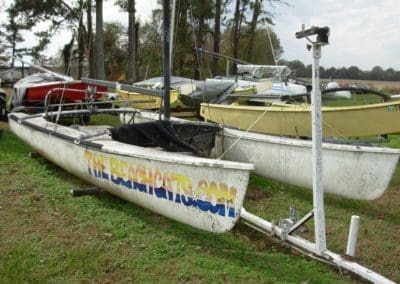 HOBIE 18 – This Hobie with trailer has intact hulls, mast, and boom. Neglected for years, it needs work.